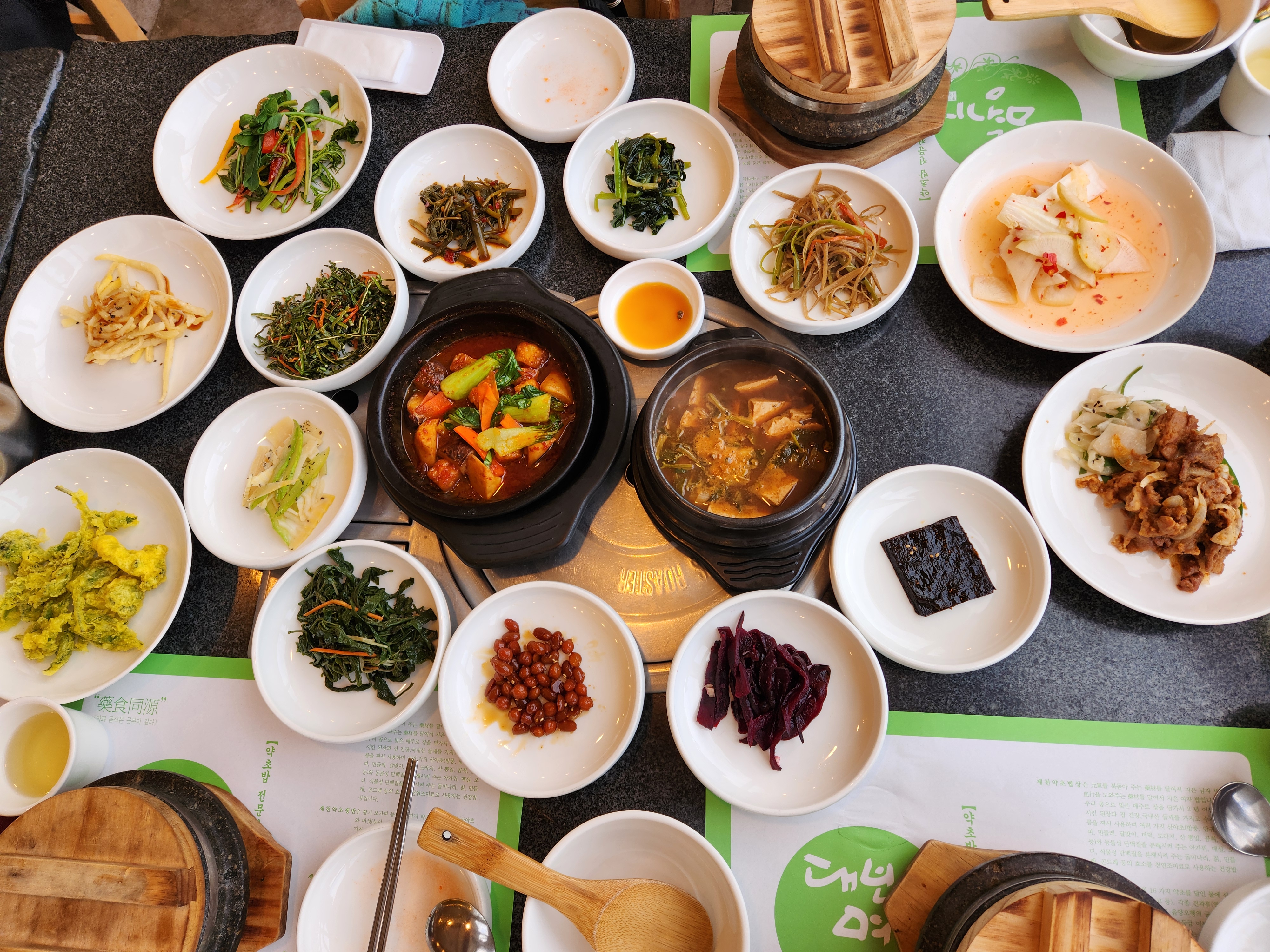 이후 각종 반찬들과 된장찌개, 돌솥밥이 나온다.